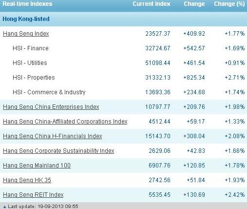 Thị trường chứng khoán Hong Kong cũng dựng đứng ngay từ khi mở cửa khi Chỉ số Hang Seng tăng hơn 400 điểm, vượt ngưỡng 23. Chỉ số S&P/ASX 200 của Australia răng 1,1%, hướng tới mức cao nhất kể từ tháng 6/2008. Quyết định duy trì quy mô QE của FED đã tạo ra bầu không khí phấn khích trên thị trường, giúp thị trường chứng khoán toàn cầu bùng nổ.